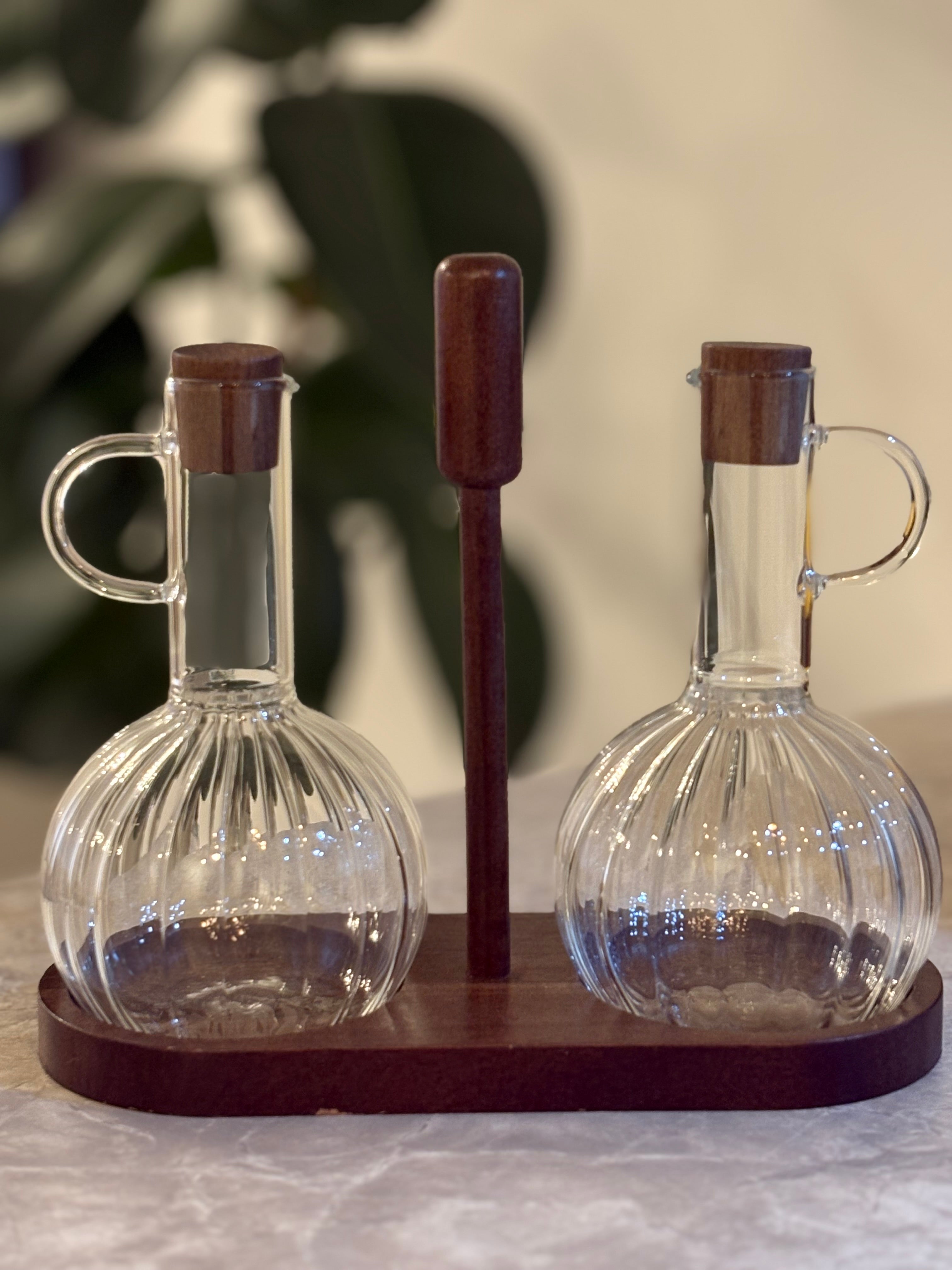 Öl- & Essigspender Set Luna Duo mit Akazienholzhalterung| 3-Teilig